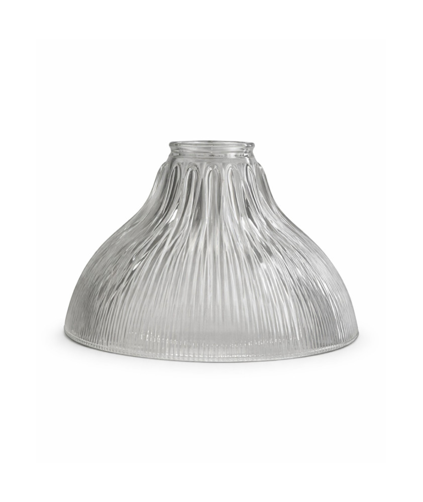 Decorative 265mm prismatic glass light shade designed to bring classic character and strong visual impact to a fitting. The distinctive Holophane-style prismatic pattern refracts light in multiple directions, creating a bright and eye-catching effect with subtle rainbow-like reflections.